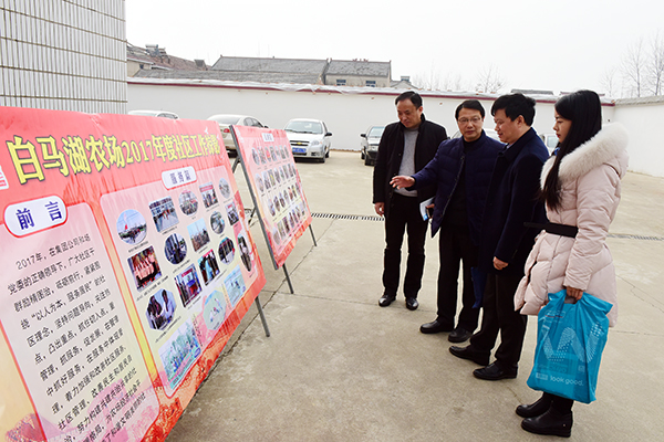 1月19日,由集團(tuán)公司人力資源部、社會(huì)事業(yè)部、資產(chǎn)經(jīng)營部、審計(jì)監(jiān)察部組成的聯(lián)合考核組一行到白馬湖農(nóng)場(chǎng)對(duì)2017年度重點(diǎn)工作完成情況及所取得主要成績等進(jìn)行綜合考核,農(nóng)場(chǎng)領(lǐng)導(dǎo)姚春華、韓躍武及相關(guān)部門負(fù)責(zé)人陪同考核并匯報(bào)情況。
