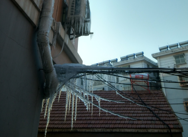 24日下午,淮海農(nóng)場城南15號樓樓頂出現(xiàn)自來水泄漏現(xiàn)象,泄漏下來的水流不僅把二樓墻壁上的空調(diào)凍成了冰凌團(tuán)子,漏下來的水沿著水管四濺,造成二樓的主樓梯口成了水簾洞,臺階也成了易滑跟頭的冰臺階。無論是空調(diào)還是臺階甚至高懸在頭頂?shù)谋?,都存有極大的安全隱患。