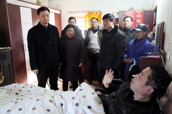 在居民新區(qū)退休職工賈則元家,姜建友來到賈則元的床前,將集團公司黨委的溫暖送到了他的心坎里,賈則元因病臥床不能說話,當(dāng)看到集團公司和農(nóng)場領(lǐng)導(dǎo)來到家中看望他時,激動的熱淚盈眶,在旁的家人再三感謝集團公司領(lǐng)導(dǎo)對他們的關(guān)心。姜建友在了解了賈則元的病情后,叮囑他的家人一定要照顧好老人的生活起居,當(dāng)?shù)弥先说貌∫荒甓嗯P床不起都是子女在照顧時,姜建友欣慰的說,有這樣的子女也是老人的福氣,希望他們繼續(xù)照顧好老人,讓老人老有所依,病有所托。在困難職工李兵家,姜建友來到床前,握著李兵的手詢問了他目前的病情和治療情況,當(dāng)?shù)弥翘悄虿【C合并發(fā)癥時,叮囑他要積極做好治療,特別是要去大醫(yī)院做檢查,控制好血糖,要樹立戰(zhàn)勝疾病的信心。所到之處,感謝聲不絕于耳,在這寒冷的冬日,困難職工的家中被一股股暖流包圍。(錢厚紅)