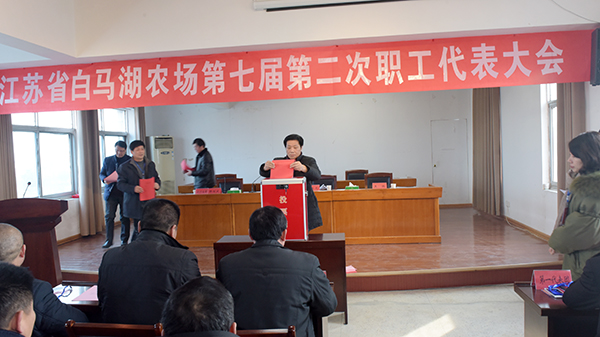 在大會(huì)預(yù)備會(huì)議通報(bào)參會(huì)人數(shù)、通過大會(huì)議程后,大會(huì)在莊嚴(yán)的國歌聲中宣告開幕,黨委書記、場長姚春華作了《關(guān)于江蘇省國營白馬湖農(nóng)場公司制改革方案的說明》,明確了改革的目的和在國有資產(chǎn)處置、法人治理結(jié)構(gòu)、組織領(lǐng)導(dǎo)、進(jìn)度安排等方面的具體要求和措施,有效地提高了代表們對農(nóng)場公司制改革的認(rèn)識(shí)和認(rèn)同。接著,大會(huì)又以舉手表決的形式,通過了職工董事、職工監(jiān)事選舉辦法,還按照規(guī)定程序和選舉辦法,分別通過票決、投票選舉和職工代表分別簽字等形式,順利通過了《關(guān)于江蘇省國營白馬湖農(nóng)場公司制改革方案的決議》,選舉產(chǎn)生了一名職工董事和一名職工監(jiān)事。黨委副書記韓正光宣讀了大會(huì)決議,宣告農(nóng)場公司制改革方案順利獲得通過。