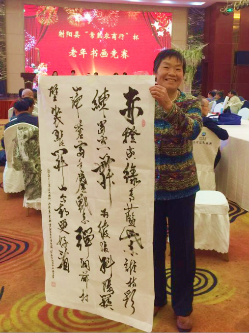 據(jù)了解,趙梅生原是江蘇農(nóng)墾淮海農(nóng)場石油機械廠的退休職工,她不但能寫一手瀟灑的字,而且小篆、隸書、楷書、草書等書法樣樣精通,家中存有一卷一卷的各類書法作品;經(jīng)她創(chuàng)作的人物肖像、山水畫、素描等作品,家中堆成了一摞一摞的。對特別鐘意、栩栩如生的繪畫,她總是裝裱起來,掛在大廳或是送給友人。無論是在上海普佗區(qū)陽光二居委書畫協(xié)會出版的《晚霞余輝》書畫作品選中,還是農(nóng)場書畫室陳列的精品展上,我們都可看到趙梅生的名字和熟悉的畫,沒有想到今年已是73歲的她,還能寫畫出如此逼真、如此飄曳的書法書畫,真是看了令人嘆為觀止。20167月,趙梅生書寫的小篆“勿忘抗日戰(zhàn)爭,頌揚民族精神,反對侵略占領(lǐng),維護世界和平”排在了拾貝軒網(wǎng)絡(luò)書法展第9名;同年10月,在射陽縣老齡協(xié)會、縣老齡辦聯(lián)合主辦的射陽縣“常熟農(nóng)商行”杯老年書畫競賽上,趙梅生的草書又獲得了二等獎;2017年在砥礪奮進的江蘇農(nóng)墾書畫大賽上,趙梅生又以一幅山水畫、一幅草書獲得了江蘇農(nóng)墾“喜迎十九大和集團黨代會、喜慶江蘇農(nóng)墾成立65周年”書畫作品展優(yōu)秀作品。