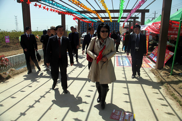 開園儀式期間,江蘇省國資委監(jiān)事會主席李海洋、江蘇農(nóng)墾集團公司黨委委員、總會計師劉克英、盱眙縣委書記梁三元、盱眙縣人民政府副縣長鄭海梁在三河農(nóng)場有限公司黨委書記、董事長、總經(jīng)理王波成、黨委副書記、董事趙廣福、黨委委員、董事、副總經(jīng)理韓樹明的陪同下參觀了三河生態(tài)梨園。