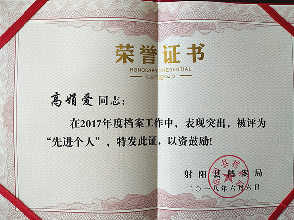 日前,射陽縣檔案局傳來喜訊,新洋農(nóng)場有限公司榮獲射陽縣2017年度檔案管理工作“先進集體”稱號,檔案管理員高娟愛榮獲2017年度檔案工作“先進個人”。