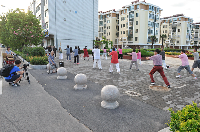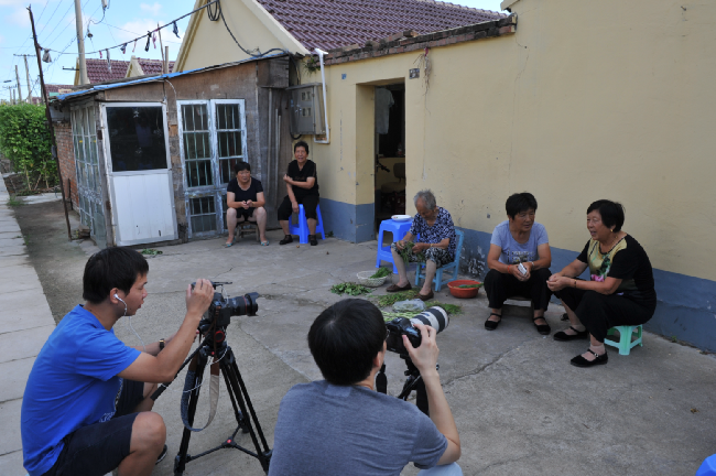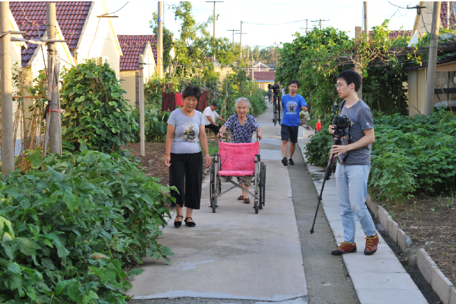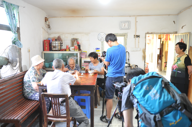 8月20下午-21日,澎湃新聞采訪組視頻記者朱偉輝、視頻編輯龍景和射陽縣新聞單位的3名記者在農(nóng)場(chǎng)宣傳部門相關(guān)人員的陪同下,用一天半的時(shí)間,實(shí)時(shí)用鏡頭記載百歲老人從凌晨起床、喝早茶、散步、游玩和吃飯、擇菜、做針線活以及與家人、鄰居等聊天的情況,感受百歲老人尋常的起居生活。而每拍攝一場(chǎng)老人的生活起居或是生活畫面,總是讓來自上海澎湃新聞采訪組的記者大加贊嘆。圖為澎湃新聞采訪組在拍攝百歲老人生活起居的一組鏡頭。