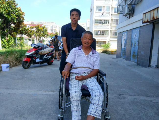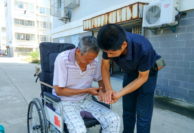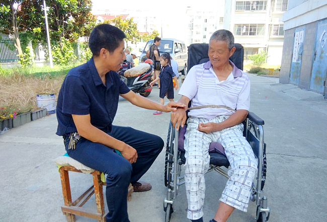 53歲的陳國軍原是淮海四分場社區(qū)農(nóng)機站的機駕人員,2004年秋季,因突發(fā)心臟病及血管方面的毛病,他在醫(yī)院里躺了一個多月才病愈;2006年,他病情復(fù)發(fā),搶救了16小時才醒了過來,從此不能從事重體力工作,每年要耗費一筆不菲醫(yī)藥費的他,被基層工會定為單位的建檔立卡貧困戶。不囿于貧困生活的他,自2005年開始,除期間到蘇州當了一年半的超市保安外,其余的時間都是上門給行動不便的老人做保姆,到目前為止,經(jīng)他服侍的老人已有22位,他在解決其他老年人頤養(yǎng)天年心愿的同時,從而也讓他自己過上了一個靠自身勞動獲得有尊嚴的生活。已經(jīng)有了經(jīng)濟來源的他,終于在去年摘掉了貧困戶的帽子,成為淮海走創(chuàng)業(yè)脫貧的典型。圖為陳國軍在為老人按摩、聊天時的鏡頭。