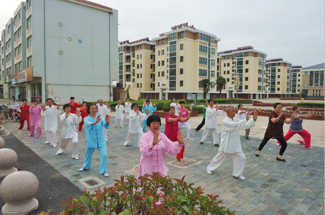 在江蘇農(nóng)墾淮海農(nóng)場(chǎng)文化廣場(chǎng)上,每天清晨總是有退休老人組成的太極拳晨練隊(duì)伍,他們總是身著純白或鮮艷色彩的太極練功服,在規(guī)定的時(shí)間內(nèi)相聚在一起,并在音樂(lè)的旋律中,時(shí)而由內(nèi)而外舒緩出自然的動(dòng)作,靜心用意,呼吸自然;時(shí)而連貫協(xié)調(diào),虛實(shí)分明的姿勢(shì),保持了身段的柔和穩(wěn)定;時(shí)而輕靈沉著,剛?cè)嵯酀?jì)的姿態(tài),無(wú)不是經(jīng)過(guò)淮海路的職工居民展示著莫大的太極功底。這支由農(nóng)場(chǎng)退休職工胡建軍為太極隊(duì)隊(duì)長(zhǎng),趙梅生為教練的太極隊(duì)伍,每天在人們的注視目光中隨著朝陽(yáng)而舞,使每一個(gè)參練隊(duì)員做到了心無(wú)旁騖,其專注的眼神、流利的動(dòng)作、恰到好處的姿勢(shì),成為朝陽(yáng)下淮海農(nóng)場(chǎng)小城鎮(zhèn)建設(shè)健身體育中最美的風(fēng)景。
