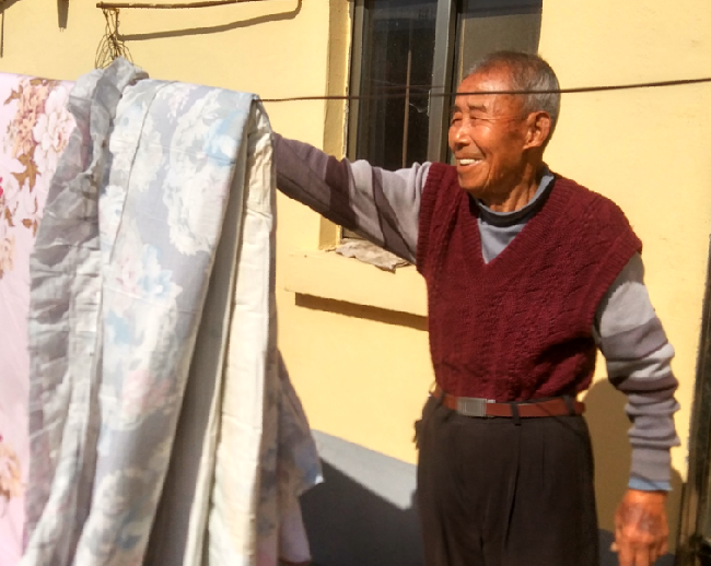 在李朋友家采訪過程中,李朋友的女兒李月春告訴我,她父親也是一個(gè)非常愛干凈的人,不但家里家外收拾的清清爽爽。只要晴天,天天把被子抱出來曬,并且一直堅(jiān)持自己的衣服自己洗,從不要兒女摻和。就是睡的被褥自己來勾,換季床鋪也是自己來開,樣樣事做得是像模像樣,從來不要兒媳她們來搭半點(diǎn)手。沒事時(shí)常拿著掃帚幫助一旁兒子們開的農(nóng)機(jī)修理間打掃衛(wèi)生,就是門前的路上,老人也常拿著掃帚清掃路面,有時(shí)還向兩邊打掃出去有百十米長(zhǎng),讓負(fù)責(zé)這片的環(huán)衛(wèi)工都要感謝他。