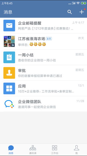 企業(yè)微信管理平臺(tái)包括網(wǎng)上打卡、審批、匯報(bào)、公告及文件盤、同事吧、公費(fèi)電話、企業(yè)郵箱、第三方應(yīng)用等軟件和企業(yè)人員通訊錄等模塊,并根據(jù)人員隸屬自動(dòng)生成全員交流群、部門交流群等。這些模塊涵蓋了淮海農(nóng)場(chǎng)有限公司日常各項(xiàng)管理工作,如文件流轉(zhuǎn)、休假審批、加班申請(qǐng)、合同審批等各方面的內(nèi)容。