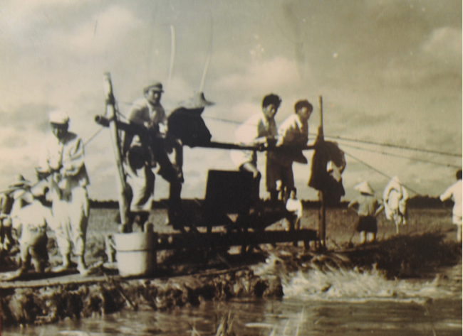 七月二十三日晚上,十二團(tuán)六連勇士們又出發(fā)了,到一分場(chǎng)場(chǎng)南二十四號(hào)至三十六號(hào)條田去排除積水。今晚不是戽水,而是用水車車水。大多數(shù)戰(zhàn)士是啟海一帶人,對(duì)踏車很生疏。面對(duì)著這樣情況,徐文和連長(zhǎng)就根據(jù)現(xiàn)有的十三架水車、八十個(gè)人,進(jìn)行科學(xué)分工,他決定會(huì)踏車與不會(huì)踏車的人搭配開(kāi)來(lái),一架水車六個(gè)人,互教互學(xué)。