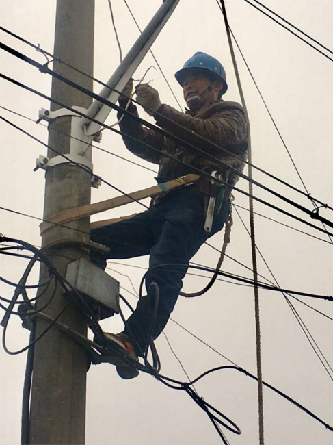 楊超元立即向中心主任匯報(bào)了情況。電管中心許小靜主任得到消息后,一邊到庫(kù)房拿取材料,一邊打電話給夏建忠電工趕來援助。5分鐘后,三位在停電現(xiàn)場(chǎng)分工合作,拉線、布線、接線。夜色越發(fā)變黑,高聳的電桿冷冰冰地伸向黝黑夜空。楊超元用嘴咬著應(yīng)急燈,爬桿、接線。凜冽的寒風(fēng)像刀一樣吹刮著他的臉,作業(yè)的手被冰得麻木了,平時(shí)幾分鐘就能弄好的接線,他在10余米的電桿上整整花費(fèi)了15分鐘。經(jīng)過2個(gè)小時(shí)的奮戰(zhàn),他們?yōu)樵撔^(qū)臨時(shí)架設(shè)了50米的線路,在22點(diǎn)恢復(fù)了供電。