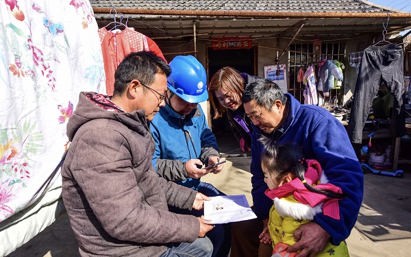 (圖為縣供電公司員工在職工居民家中辦理用戶過名業(yè)務(wù))