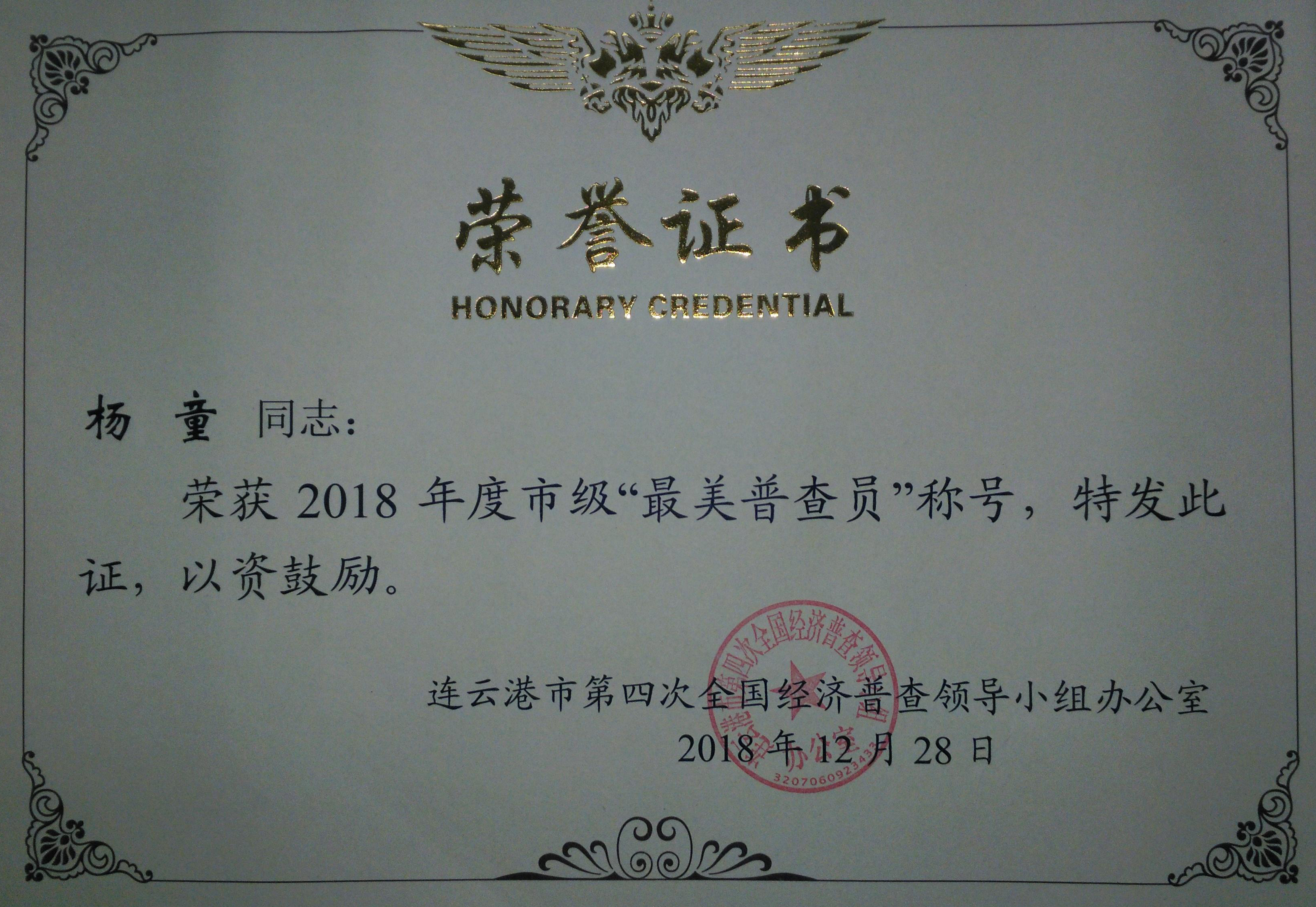 (圖為東辛楊童獲得“最美普查員”榮譽證書)