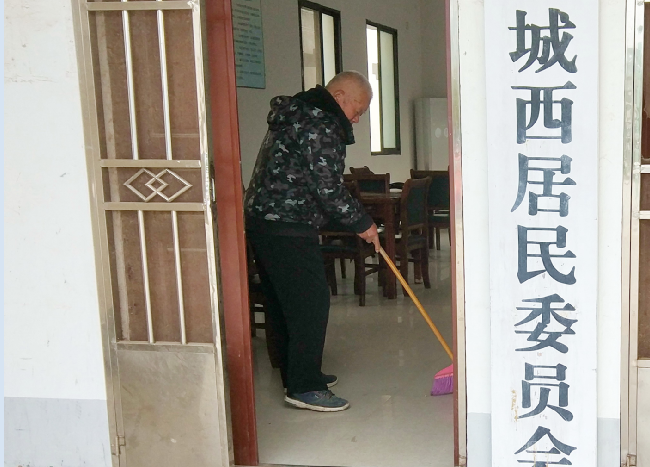 “環(huán)境好了,大家也愿意來到這里娛樂,再說自己也感到清爽。”顧老漢邊掃著地邊與筆者說。圖為顧兆桃老人在打掃衛(wèi)生。