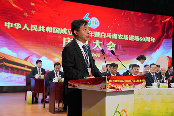 胡兆輝在講話中指出,建場60年來,一代又一代白馬湖人傳承和弘揚“艱苦奮斗、勇于奉獻、開拓創(chuàng)新”的農(nóng)墾精神,櫛風沐雨、薪火相傳,形成了以種植業(yè)為基礎,種子為龍頭,育繁推、產(chǎn)加銷一體化經(jīng)營、綠化林苗和水產(chǎn)養(yǎng)殖協(xié)同發(fā)展的現(xiàn)代農(nóng)業(yè)產(chǎn)業(yè)體系;實現(xiàn)了綜合實力和發(fā)展質(zhì)量穩(wěn)步提升,城鎮(zhèn)面貌和生態(tài)環(huán)境持續(xù)改善,公共服務和社會治理水平顯著提高,職工群眾生活質(zhì)量和幸福指數(shù)不斷攀升。