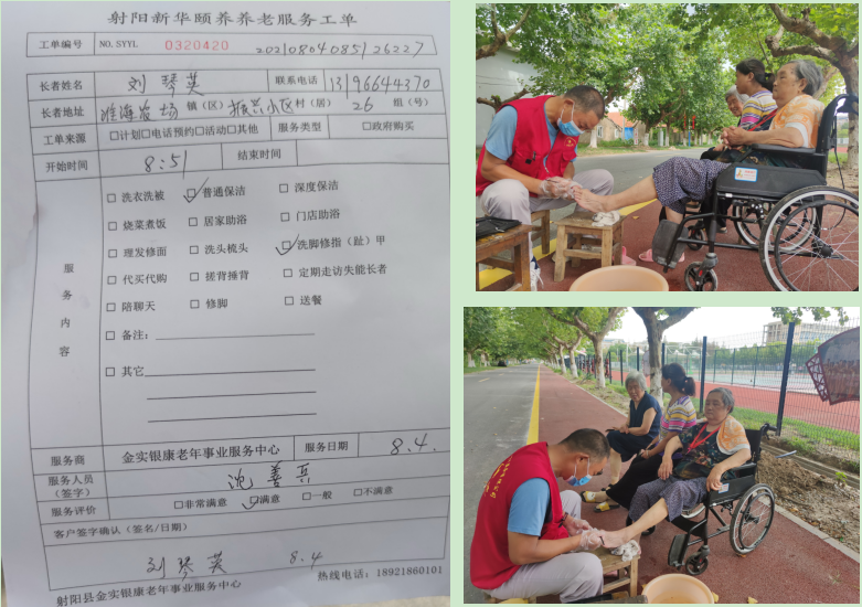 交談中,這位居住在農(nóng)場城西居委會振興小區(qū)26號,88歲的居民劉琴英,在享受到一個小時的居家普通保潔和洗腳修指(趾)甲服務(wù)后很是開心。“感謝金實銀康和農(nóng)場社區(qū)居家養(yǎng)老給我們老年人帶來的服務(wù),感謝護理員沈善兵對我提供無微不至的關(guān)心服務(wù)。”