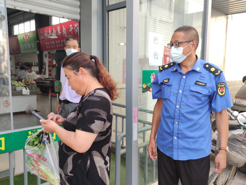 “還請(qǐng)你輸入下密碼?!闭f(shuō)著,曹習(xí)生將手機(jī)遞到了買(mǎi)菜的居民手中。整個(gè)過(guò)程僅幾分鐘光景,就化解了居民沒(méi)戴口罩進(jìn)出菜市場(chǎng)的難題。