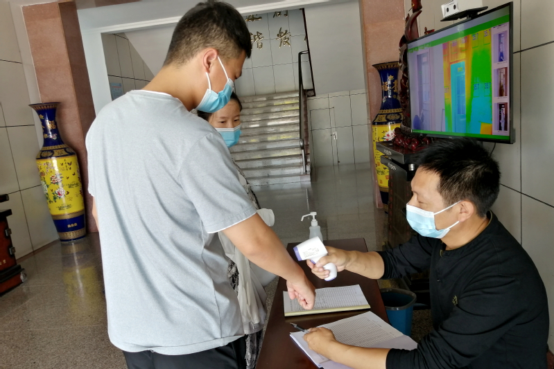圖為農(nóng)場機(jī)關(guān)工作人員上班接受體溫檢測