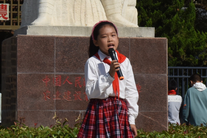 “各位同學(xué),早上好,歡迎大家到我們農(nóng)建四師陳列館參觀!我是淮海農(nóng)場(chǎng)學(xué)校二年級(jí)學(xué)生于曉冉,也是我們陳列館的編外義務(wù)講解員,下面就由我來給大家介紹我們館的紀(jì)念碑白玉雕像……”9月28日上午,淮海農(nóng)場(chǎng)小學(xué)二年級(jí)于曉冉,她作為農(nóng)建四師的紅色小小講解員,開啟了為學(xué)校學(xué)生講述發(fā)生在農(nóng)建四師軍墾傳統(tǒng)的紅色故事。