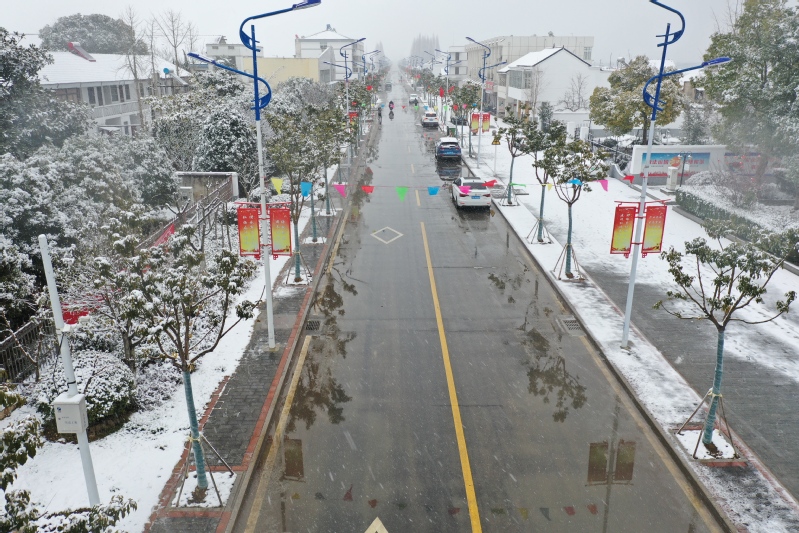 高大的銀杏樹、柿子樹,落光了葉子的枝杈上,一條條毛茸茸、亮晶晶的銀條兒好像蟄伏著的蠶蟲;修長(zhǎng)的香樟、低矮的柏樹,四季常青枝葉上,一朵朵蓬松松、沉甸甸的雪球,仿佛舉起的棉花糖。“呼……”一輛晨起的公交車閃著光駛過(guò),一面面紅旗也迎風(fēng)雀躍起來(lái),似乎在說(shuō)“又是一個(gè)豐收年”。