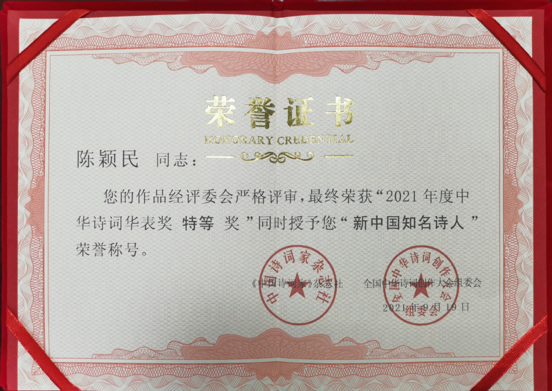 新洋農(nóng)場(chǎng)退休職工陳穎民在全國(guó)中華詩(shī)詞創(chuàng)作大會(huì)組委會(huì)舉辦的中華詩(shī)詞華表獎(jiǎng)中,獲得“特等獎(jiǎng)”并被授予“新中國(guó)知名詩(shī)人”榮譽(yù)稱號(hào)。