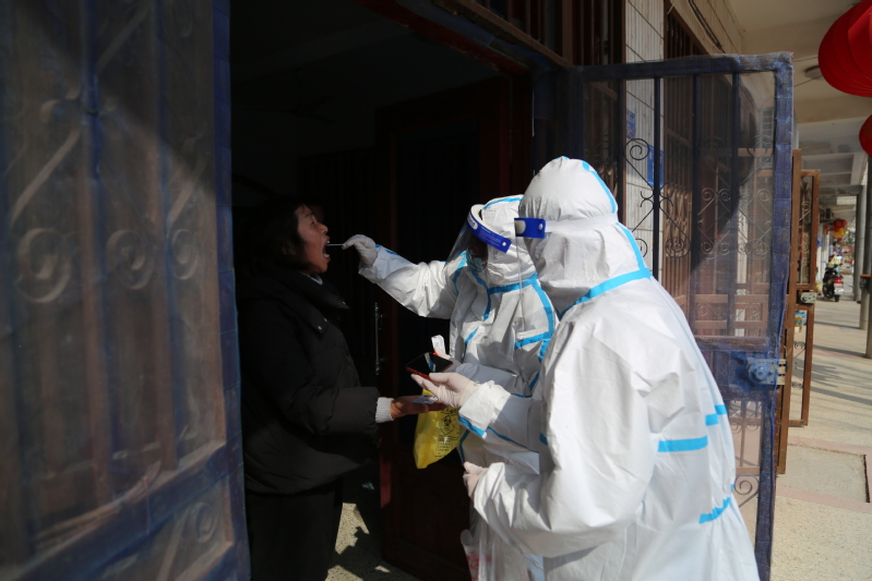35日,連云港市海州區(qū)通報發(fā)生新冠肺炎疫情,形勢十分嚴峻。崗埠上下迅速行動起來,按照要求組織開展全員核酸檢測。全員核酸檢測要求一天內(nèi)對崗埠所有在家人員進行檢測,農(nóng)場四個點位同時開始,負責檢測的人員特別緊張。馬素蓮得知這一情況,主動和相關(guān)人員溝通,暫停了自家門診,帶領(lǐng)醫(yī)生錢冬梅、護士錢明霞加入了振興廣場籃球場監(jiān)測點的核酸檢測人員隊伍。從35日到11日,她們?nèi)艘恢眻允卦诤怂釞z測一線,每天檢測人員合計達到兩三千人。有時候,她們需要配合網(wǎng)格員深入鎮(zhèn)區(qū)、生產(chǎn)區(qū)各居委會上門為行動不便的人員進行采樣,足跡遍布大街小巷,密不透風的防護服常常讓她們滿臉通紅透不過氣來。護士錢明霞告訴筆者,311日當天,她負責部分小區(qū)的核酸采樣工作,光是6樓就爬了6次,腿最后跟灌了鉛一樣,挪不動?!坝袝r候晚上嘴里吃著東西就睡著了。”