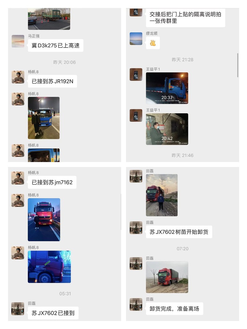 “冀D3k275已上高速”“已接到蘇JR192N”“空車回場,行程碼無星號(hào),居家隔離”“蘇JX7602樹苗開始卸貨”……弶港農(nóng)場“疫”線黨員突擊隊(duì)微信群里的工作匯報(bào)內(nèi)容簡短,工作流程圖像清晰,值班人員和應(yīng)急小組24小時(shí)在線,全力為場域內(nèi)企業(yè)企業(yè)穩(wěn)產(chǎn)保供保駕護(hù)航。
