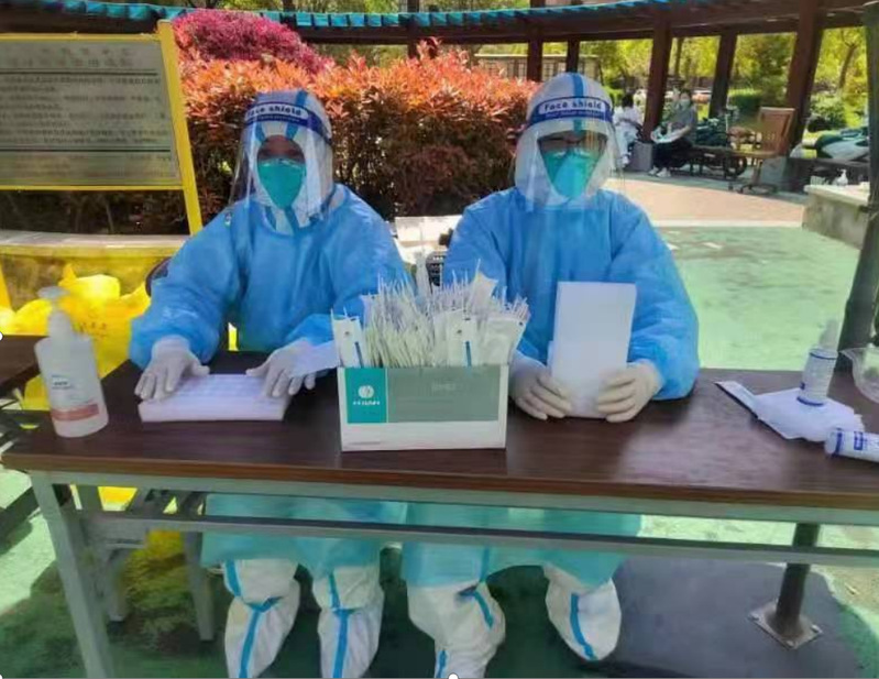 一日為醫(yī),終生不棄。張紅主動擔(dān)當(dāng)國企的責(zé)任與使命。4月4日凌晨6點(diǎn)趕到上海浦東新區(qū)川沙鎮(zhèn)社區(qū),醫(yī)務(wù)人員相互之間穿戴好防護(hù)服、護(hù)目鏡、口罩、鞋套、手套、帽子,并進(jìn)行嚴(yán)而又嚴(yán)、實而又實、細(xì)而又細(xì)的防護(hù)檢查,沒有休息片刻就立即投入核酸采集的戰(zhàn)斗中。浦東新區(qū)疫情形勢嚴(yán)峻,面對被感染的風(fēng)險和高負(fù)荷的工作壓力,張紅有條不紊地進(jìn)行核酸檢測采集工作。這是上海浦東新區(qū)全民核酸檢測第三天,也是核酸采集壓力最大的一天,采集現(xiàn)場的布置、醫(yī)護(hù)人員與新設(shè)備的磨合、工作人員與社區(qū)、居委會人員的協(xié)調(diào)、居民采集核酸的急迫心情等,多重矛盾交織在一起。對此,張紅和其他醫(yī)務(wù)人員爭分奪秒抓緊進(jìn)行核酸檢測,炎熱的天氣、高強(qiáng)度的工作加之憋悶的防護(hù)裝備,衣衫不停的被汗水浸濕,再被身體烘干,再浸濕……臉部深深的壓痕成了標(biāo)配,人在汗水“泡”著里工作成了常態(tài)……到了晚上,為了緩解上海市疫情防控壓力,張紅又和同事們一起乘上大客車連夜返回到響水,趕到響水時已是4月5日凌晨1點(diǎn)多了。第一趟完成核酸檢測任務(wù)連續(xù)30個小時不吃不喝,張紅不言苦、不叫累。她堅持以高度的責(zé)任心為前來做核酸檢測的人員提供服務(wù),她用真情和愛心譜寫著平凡而動人的天使之歌!
