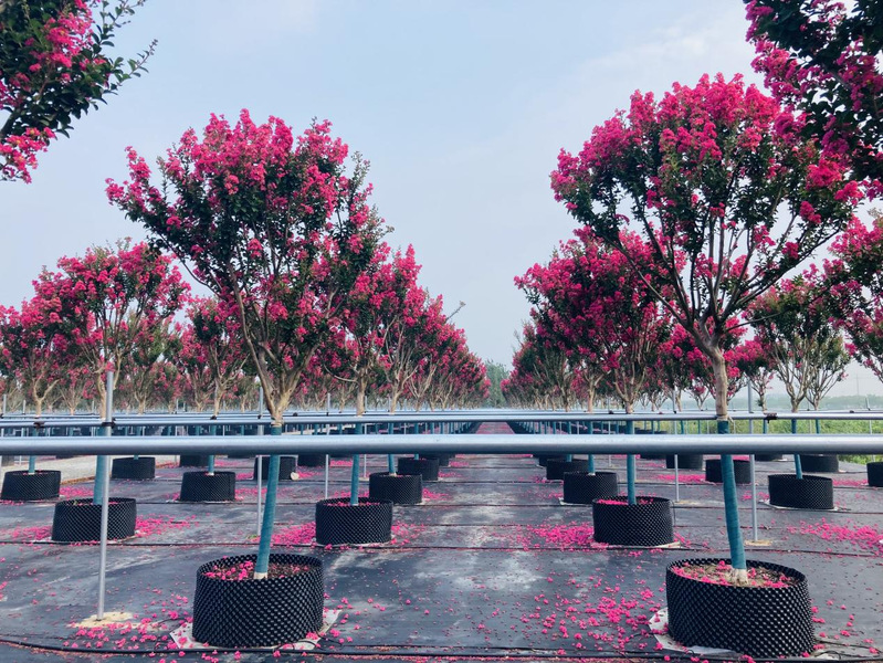 新洋林業(yè)公司容器苗三期當(dāng)下正是一幅花開似霞的盛景,紫薇花團(tuán)團(tuán)簇簇掛滿枝頭,相當(dāng)奪目。拳頭產(chǎn)品“四川紅”紫薇是農(nóng)場公司黨委和林業(yè)公司4月份頂著疫情的壓力,積極爭取引進(jìn)的產(chǎn)品,到了7月份便成為了附近居民的網(wǎng)紅打卡產(chǎn)品,獲得了居民們的一致好評和稱贊。其花期極長,從6月一直持續(xù)到10月,宋代楊萬里贊曰:“誰道花無紅百日,紫薇常放半年花?!泵鞔ピ娫疲骸白限遍_最久,爛漫十旬期?!币虼?,紫薇也有“百日紅”之稱。