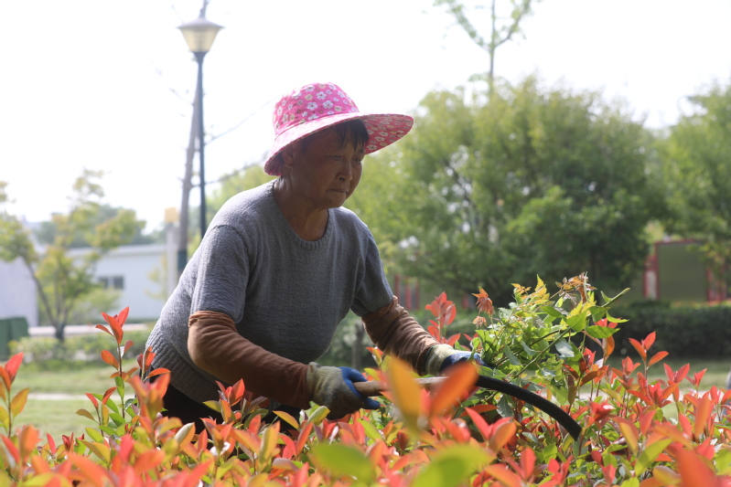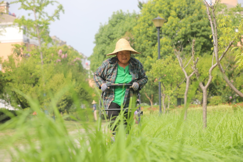 727日,寶應(yīng)湖農(nóng)場職工文化公園,7名工人正在為公園綠化除草。越是高溫雜草長得越旺。以席正英為隊(duì)長的綠化員們分工合作。草坪上用電動(dòng)切草機(jī)清理,隨著“隆隆”的機(jī)聲,切碎的草屑在刀頭間飛濺,濺到了工人的身上、飛上了工人的臉龐,刺癢刺癢,淡淡的青草味洋溢在夏日的晨光里。綠化帶里,爬騰類的雜草枝枝蔓蔓,覆蓋的綠化樹上,工人們就用手先拉斷經(jīng)脈,再扯掉枝葉;低矮類的雜草擁擠在綠化樹間,工人們蹲下身子就用手拔、用刀割。當(dāng)天7名工人清理綠化300多平方米。
