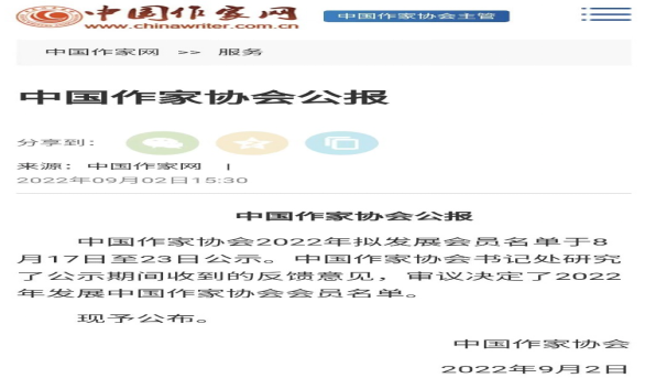 近日,根據(jù)中國作家協(xié)會公報(bào),中國作家協(xié)會2022年擬發(fā)展會員名單于8月17日至23日公示。中國作家協(xié)會書記處研究了公示期間收到的反饋意見,審議決定了2022年發(fā)展中國作家協(xié)會會員名單,并于2022年9月2日進(jìn)行公布。其中江蘇60人,江心沙農(nóng)場有限公司90后職工袁偉榜上有名。