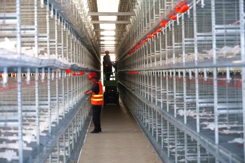 近日,新曹農(nóng)場抓好抓實百萬羽蛋雞產(chǎn)業(yè)項目工程建設(shè),全力以赴加快工程進度,確保年底一期工程完工,沖刺四季度。圖為現(xiàn)代化雞舍內(nèi)部,工人緊鑼密鼓安裝、調(diào)試雞籠設(shè)施。