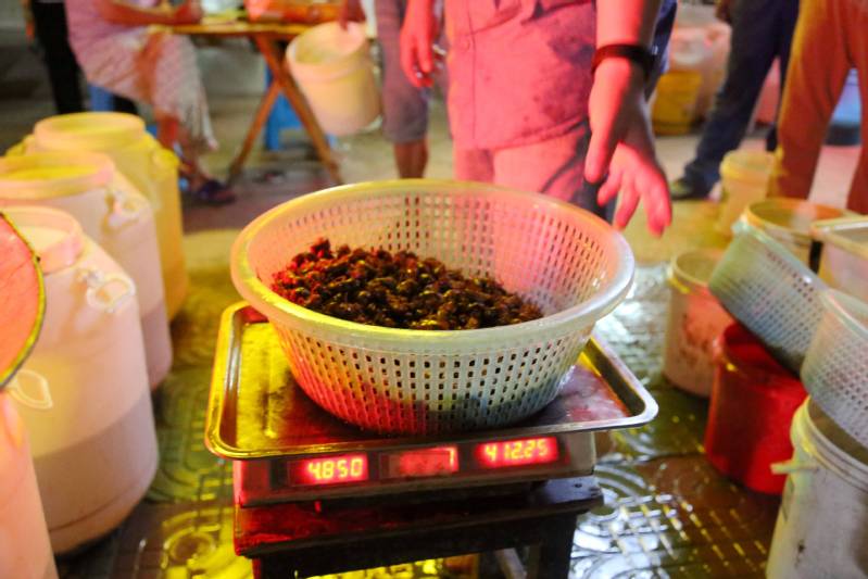 夏夜暑熱退去,新曹農場河邊林帶、國道兩側、集鎮(zhèn)周邊,小樹林里經常光影搖曳、星星點點,人們拿著手電筒等照明裝備仔細在每棵樹上尋摸,只為找到獨屬夏季的舌尖美味——金蟬。老百姓熱衷抓蟬、吃蟬,價格由最初的每只0.3元到如今的每只1元左右,10年內小小金蟬身價翻了3倍,一躍成為新的致富“頂流”。“金蟬捕捉高峰期能有20多天,一家人一晚可以捉1000多元,每年靠捉金蟬就有近2萬元的收益,我們這一個點一晚收購數(shù)量在5000斤以上,平均價每斤90元以上,年產值900萬元?!苯鹣s收購點老板何成剛說。