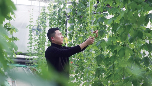 江蘇農(nóng)墾集團云臺農(nóng)場利用資源優(yōu)勢,積極與龍頭企業(yè)、科研機構(gòu)對接,開發(fā)特色種植。目前,與蘇墾麥芽公司訂單種植的大棚啤酒花長勢喜人。圖為技術(shù)人員正在為新長出的啤酒花側(cè)枝繞蔓。 程軍 攝