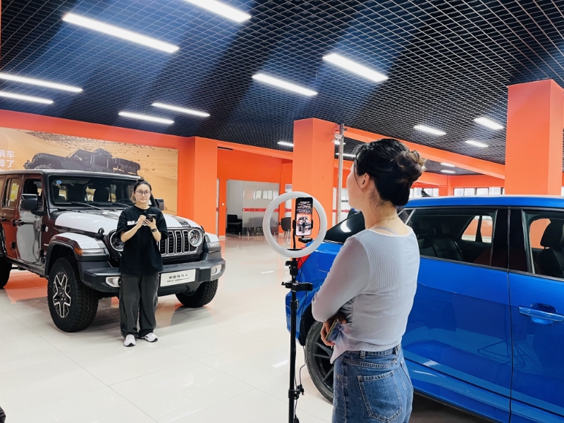 “牧馬人原廠配備全地形255 75/R18輪胎,中控觸摸屏由8寸升級(jí)到12寸,涉水深度達(dá)760mm?!碧K舜錦尚公司(Jeep4S店)主播陳佳琪正通過直播間為客戶360°全方位展示和講解車輛配置,耐心解答客戶問題,1名客戶成功預(yù)約進(jìn)店。