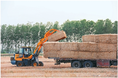 在江蘇省連云港市海州區(qū)的江蘇農(nóng)墾崗埠農(nóng)場,農(nóng)民在田間打捆回收小麥秸稈,進(jìn)行集中轉(zhuǎn)運堆放。