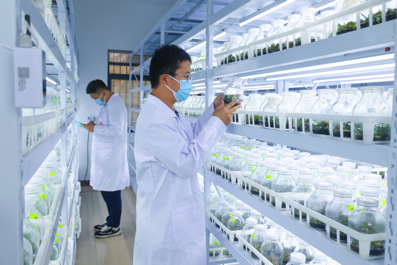 在江蘇農(nóng)墾云臺農(nóng)場的蝴蝶蘭培養(yǎng)室里,培養(yǎng)架上排列著一瓶瓶嫩綠的幼苗。通過精準調(diào)控光照波長、濕度梯度和營養(yǎng)配方,不僅可以縮短蝴蝶蘭育苗周期,還能顯著提高苗子的成活率和抗病性。圖為技術(shù)人員在開展日常蝴蝶蘭幼苗培育觀測工作,并同步系統(tǒng)記錄生長數(shù)據(jù)及環(huán)境調(diào)控參數(shù)。