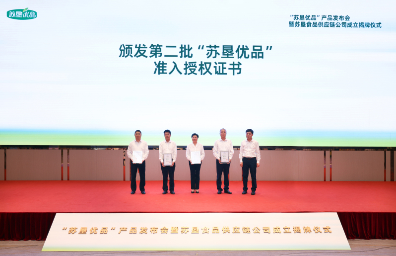 活動現(xiàn)場,吳本輝與中山大廈負責人共同為蘇墾食品供應鏈公司成立揭牌。朱浩為第二批“蘇墾優(yōu)品”生產(chǎn)單位頒發(fā)授權(quán)證書。王立新在致辭中系統(tǒng)闡述了“蘇墾優(yōu)品”產(chǎn)品的價值定位、市場定位和質(zhì)量保障體系,并介紹了蘇墾食品供應鏈公司的組建背景與發(fā)展愿景。