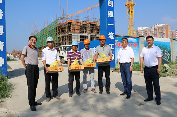 8月8日上午,烈日當頭,酷暑難耐,在東辛農(nóng)場有限公司銀羽住宅新區(qū)供電線路鋪設現(xiàn)場,集團公司工會主席佟曉廷一行在東辛黨委書記韓中書、紀委書記王緒國、