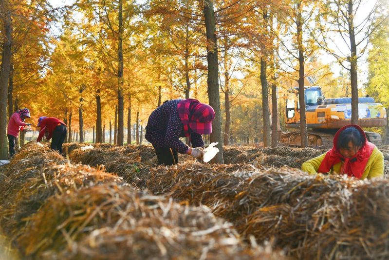 “先檢查下溫度,再把赤松茸菌種放進營養(yǎng)基里面……”12月17日上午,在淮海農(nóng)場中山杉林地菌菇種植現(xiàn)場,商物公司生產(chǎn)基地技術員袁亞洲再三叮囑著每位員工。只見員工們小心地在林間播撒菌種,嚴格控制種植間距與深度,確保菌種能夠充分接觸土壤并獲得適宜的生長環(huán)境?!爸猩缴剂謳Лh(huán)境陰涼濕潤,為喜陰的羊肚菌和赤松茸提供了得天獨厚的生長條件,林下種植模式不僅能有效利用閑置土地,還能借助林下的小氣候,減少菌菇種植過程中的水分蒸發(fā)與溫度波動,降低人工控溫控濕成本?!痹瑏喼藿榻B說,“菌菇生長過程中釋放的二氧化碳可被樹木吸收,而樹木的枯枝落葉又能作為天然肥料回饋土壤,滋養(yǎng)菌菇,形成互利共生的生態(tài)循環(huán)?!睋?jù)了解,本次林下種植羊肚菌和赤松茸,充分利用6畝中山杉林帶林下空閑的土地資源,其中5畝種植羊肚菌,1畝種植赤松茸,用生態(tài)循環(huán)農(nóng)業(yè)發(fā)展的新模式,探索林業(yè)與菌菇產(chǎn)業(yè)的協(xié)同發(fā)展。近年來,在產(chǎn)業(yè)發(fā)展的征程中,淮海農(nóng)場公司一直致力于挖掘新的經(jīng)濟增長點,目前在羊肚菌、赤松茸等菌菇大棚種植成功的基礎上,今年又將探索林下種植的新模式,從12月中下旬開始播種,預計明年3月中下旬進入采摘期。羊肚菌不僅種植周期短、收益高,有著廣闊的市