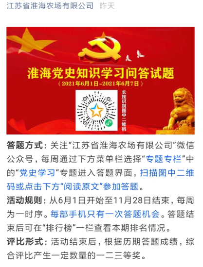 淮海農(nóng)場公司黨委工作部將在每周一通過農(nóng)場公司微信公眾號平臺發(fā)布當周黨史學習教育答卷考題,分別以單選、多選、對錯題型出現(xiàn),讓大家在參與中,回顧黨的光輝歷程,謳歌黨的豐功偉績,為推動淮海高質(zhì)量發(fā)展提供有力保障。據(jù)悉,每部手機只有一次答題機會。答題結(jié)束后可以在“排行榜”一欄查看自己當期在本周本時段的排名。答題方式:關(guān)注“淮海微信公眾號”,每周通過下方菜單欄進入本周答題頁面進行答題?;顒营剟睿簩⒏鶕?jù)答題成績和參賽人員數(shù)量,最張產(chǎn)生出一定數(shù)量的一二三等獎。