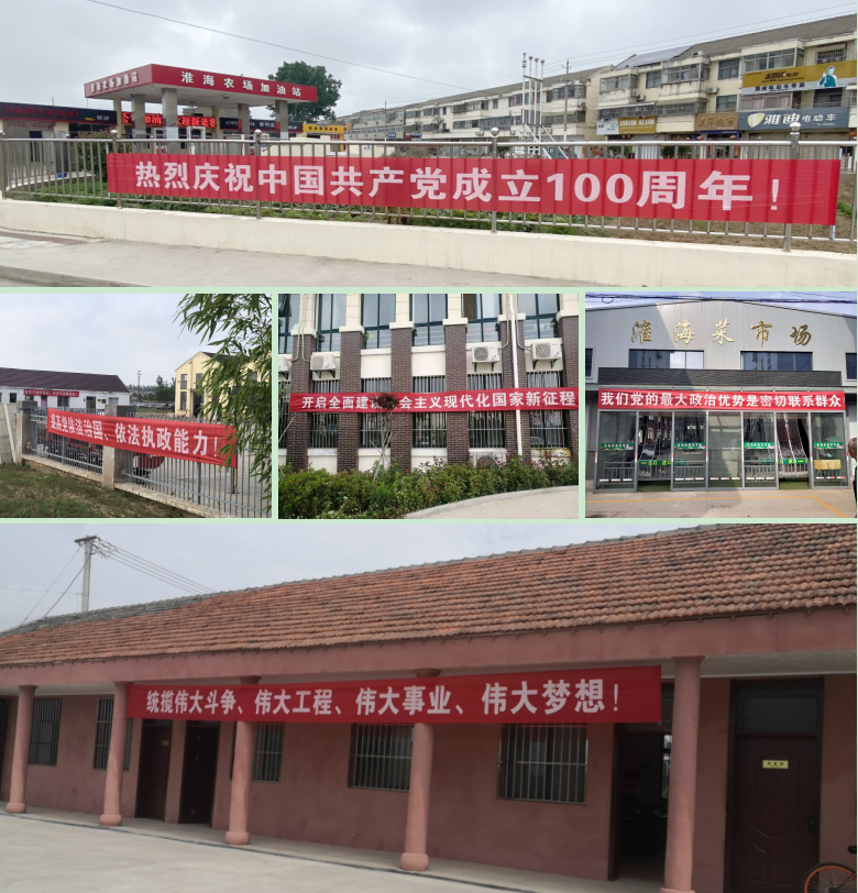 “七一”期間,無論是在淮海農(nóng)場場部小城鎮(zhèn),還是各分場社區(qū)或是二三產(chǎn)單位,我們在這些單位,總會看到那一抹“中國紅”,這些黨史學(xué)習(xí)教育的文字橫幅,成為淮海農(nóng)場靚麗的風(fēng)景線,振奮著人心,激勵著人們向前向前永向前。