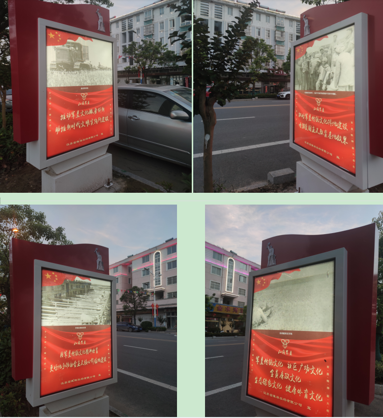 這些燈箱中,廣告燈箱的一面看到統(tǒng)一印制的建黨百年歷史的畫面外,在燈箱的另一面,除了印制江蘇農(nóng)墾統(tǒng)一的LG標識和“不忘初心 繼續(xù)前行”“軍墾精神 薪火相傳”的細小字體外,還分別印有農(nóng)建四師將士在農(nóng)場“三大戰(zhàn)役”進程中開墾建設的不同老照片附說明,印有不同風格的軍墾傳統(tǒng)文化標語,并在畫面外的框架上,安裝了鑲嵌在其上的軍墾傳統(tǒng)文化的標志,濃郁的軍墾傳統(tǒng)文化在廣告燈箱中的完美組合,讓仍健在的老軍墾們甚是激動,說農(nóng)場黨委以這種方式宣傳弘揚軍墾傳統(tǒng)文化,這是對他們建設農(nóng)場最好的肯定。