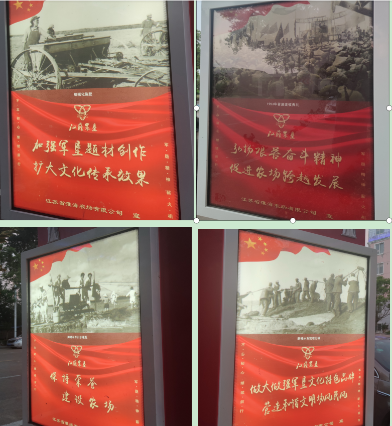 今年5月初,淮海農(nóng)場公司通過在一公里長的淮海路兩邊,安裝36座宣傳廣告燈箱,并以這種形式慶祝中國共產(chǎn)黨成立100周年的同時,還將軍墾傳統(tǒng)文化有效地融入到路邊廣告的燈箱中,通過讓廣大職工居民和過往游客,在研讀觀看中,體味老照片背后生動的故事,了解軍墾傳統(tǒng)文化標語對推進農(nóng)場五個文明建設中的作用,從而更加深刻地了解淮海農(nóng)建四師將士們創(chuàng)建的軍墾傳統(tǒng)文化,并人傳承中更好地踐行好淮海精神,為“創(chuàng)新淮海、實力淮海、和諧淮海、美麗淮海”營造出持續(xù)發(fā)展的動力。附:淮海路兩側路邊廣告燈箱標語欣賞。