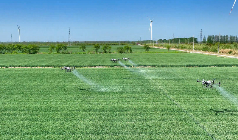 在蘇墾農(nóng)發(fā)新洋分公司新北生產(chǎn)區(qū)高標(biāo)準(zhǔn)農(nóng)田,五臺(tái)滿載生物藥劑的北斗導(dǎo)航植保無(wú)人機(jī)正沿著預(yù)設(shè)航線精準(zhǔn)噴灑葉面肥,多光譜測(cè)繪無(wú)人機(jī)同步監(jiān)測(cè)苗情長(zhǎng)勢(shì),全力守護(hù)麥田健康。新洋分公司將綠色防控與統(tǒng)防統(tǒng)治有機(jī)結(jié)合,所有基層一線青年員工全部掌握無(wú)人機(jī)操作技術(shù),實(shí)現(xiàn)了近6萬(wàn)畝農(nóng)田的飛防作業(yè)全覆蓋。目前,共引入更新大疆T70、T100等新型無(wú)人機(jī)23臺(tái)。
