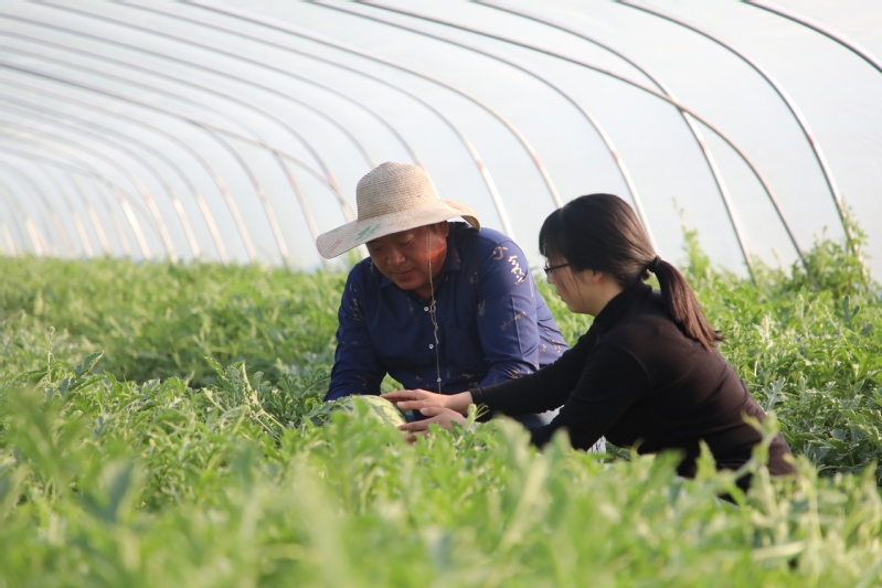 日前,江心沙農(nóng)場(chǎng)的西瓜陸續(xù)進(jìn)入批量上市階段。圖為江心有田分公司黨支部書記周璐璐逐一走訪西瓜種植戶,仔細(xì)查看西瓜的長(zhǎng)勢(shì)、品相和成熟度,為批量采摘和定點(diǎn)供應(yīng)再檢驗(yàn)、再把關(guān)。