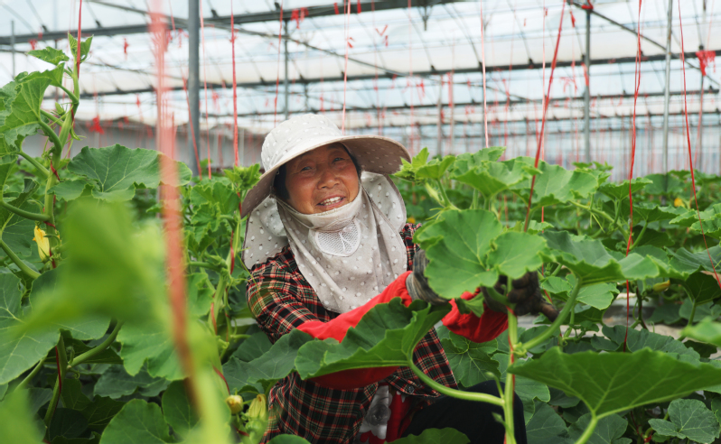 5月3日,興墾科技工作人員在大棚里進(jìn)行作物管理。圖1,工作人員為新品番茄進(jìn)行人工授粉,圖2,工作人員為貝貝南瓜進(jìn)行搭蔓。
