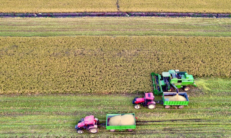 豐收時節(jié)碩果飄香,黃澄澄的稻谷鋪滿大地,紅彤彤的高粱俏立枝頭,穗粒飽滿,猶如紅火的云霞……豐收碩果驚艷了黃海大地,悄然繪就多彩豐收圖。10月24日,江蘇農(nóng)墾黃海農(nóng)場11萬畝水稻迎來豐收?,F(xiàn)場收割機(jī)的隆隆轟鳴,糧食運輸車輛來回穿梭,確保水稻應(yīng)收盡收、機(jī)收減損、顆粒歸倉。據(jù)了解,黃海水稻收割機(jī)械近200臺在田作業(yè),收割機(jī)械化率達(dá)100%。黃海大面積水稻收獲峰期將在本月末前后,預(yù)計經(jīng)一周努力,水稻即可收獲告罄。黃海將以“搶”字為先,抓住有利天氣,及時進(jìn)行晾曬和儲存,保障糧食安全。進(jìn)一步優(yōu)化生產(chǎn)布局,推動秋種生產(chǎn)順利進(jìn)行,推進(jìn)農(nóng)業(yè)生產(chǎn)結(jié)構(gòu)優(yōu)化和調(diào)整,夯實明年夏糧豐產(chǎn)豐收基礎(chǔ)?;鸺t,也是豐收的顏色。在外拓基地,8400畝酒用高粱進(jìn)入全面收割階段,一輛輛高粱收割一體機(jī)轟鳴著來回穿梭,一株株穗大粒密的高粱被收割機(jī)納入后吐出,粉碎后的秸稈撒在地里,留下粒粒飽滿的果實,形成了一幅美麗的豐收畫卷。自江蘇農(nóng)墾(蘇墾農(nóng)發(fā))與蘇酒集團(tuán)(洋河股份)共同推進(jìn)綠色原糧基地建設(shè)戰(zhàn)略合作協(xié)議簽訂以來,宿遷分公司充分發(fā)揮區(qū)位優(yōu)勢,奏響農(nóng)墾“示范區(qū)、國家隊”主旋律,開始逐步推進(jìn)高粱規(guī)?;N植,達(dá)到穩(wěn)產(chǎn)增收的同時能夠進(jìn)一步調(diào)節(jié)