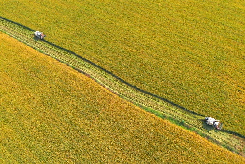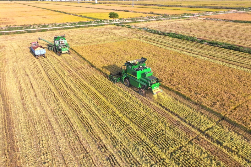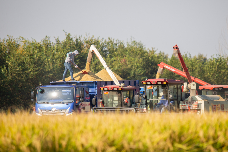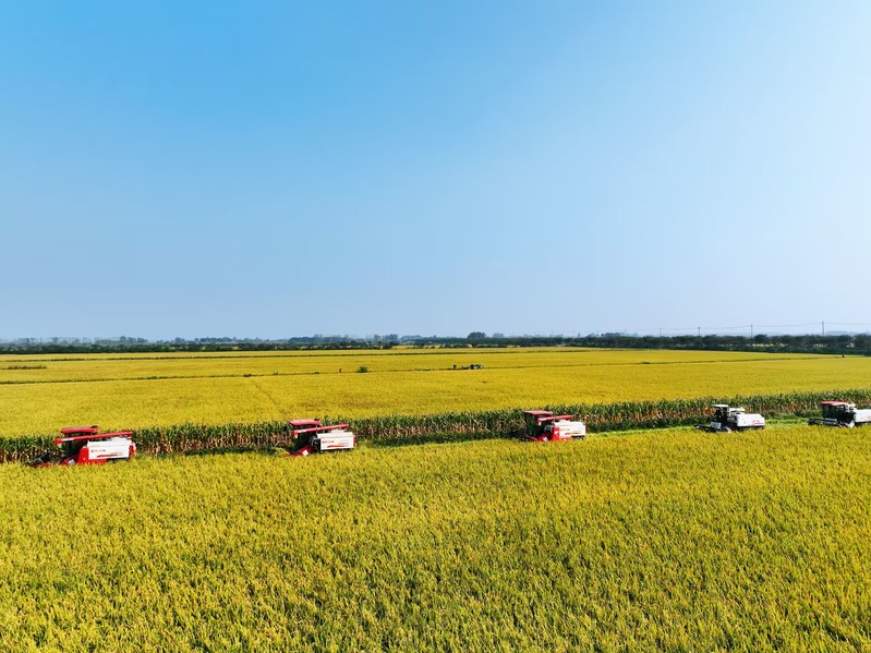 “開鐮了!豐收了!”10月17日上午10時,一臺臺聯(lián)合收割機(jī)駛向蘇墾農(nóng)發(fā)新洋分公司新北生產(chǎn)區(qū)5大隊,金黃的水稻被大型機(jī)械收入“囊”中,新洋5.3萬畝水稻機(jī)收作業(yè)正式拉開序幕。今年“三秋”是集團(tuán)公司第二次黨代會勝利召開后的第一個農(nóng)忙,做好“三秋”工作意義重大,黨委班子成員靠前指揮,深入田間查看水稻收割情況。稻田接連成片,稻穗迎風(fēng)擺動,收割機(jī)馬力全開、縱橫馳騁,收割、脫粒、裝車……一氣呵成,一派豐收的喜人景象。收割現(xiàn)場,蘇墾農(nóng)發(fā)新洋分公司嚴(yán)格收割質(zhì)量監(jiān)督,把機(jī)械減損作為糧食增產(chǎn)的重點,加大收割質(zhì)量檢查力度,減少收割損失,實現(xiàn)秋糧顆粒歸倉?!拔覀兠芮嘘P(guān)注天氣情況和水稻成熟度,統(tǒng)籌安排,堅持質(zhì)量第一,進(jìn)度第二,努力做到成熟一塊收割一塊,穩(wěn)步推進(jìn)收割進(jìn)度?!鞭r(nóng)業(yè)中心負(fù)責(zé)人介紹。蘇墾農(nóng)發(fā)新洋分公司立足“前期‘揀’收、中期‘穩(wěn)’收、后期‘搶’收”的原則,充分利用秋收早期溫度高,有利晾曬、烘干的條件,適時收、曬、烘,為秋播及時騰茬,確保11月6日前完成秋播田塊收割任務(wù)。面對不穩(wěn)定天氣因素,蘇墾農(nóng)發(fā)新洋分公司強(qiáng)化機(jī)械保障,本部準(zhǔn)備收割機(jī)58臺套,運糧車53臺,另調(diào)度好26臺小型履帶式收割機(jī),隨時應(yīng)對突發(fā)