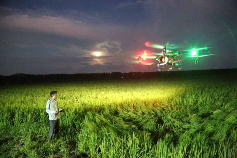 “這塊地是梯形的,等會這塊地飛完,要把地邊找一找,防止漏飛?!?月30日晚,在蘇墾農(nóng)發(fā)崗埠分公司王溝生產(chǎn)區(qū)葛莊隊(duì)的一處田邊,大隊(duì)管理員葛高樹正和無人機(jī)飛手進(jìn)行交流,叮囑操作注意事項(xiàng)。在田間,一架大型無人機(jī)閃爍著燈光,在飛手的操作下有條不紊地進(jìn)行噴施作業(yè),所到之處卷起陣陣白霧。眼下正是水稻產(chǎn)量形成的關(guān)鍵時(shí)期,也是病蟲害高發(fā)時(shí)期。連日來,崗埠分公司組織農(nóng)業(yè)科、生產(chǎn)區(qū)農(nóng)技人員和大隊(duì)管理員,著眼紋枯病、稻曲病、稻縱卷葉螟、稻飛虱等高發(fā)病蟲害,深入田間展開排查統(tǒng)計(jì),分類施策,科學(xué)開展肥水管理和綠色防控,抓好4.5萬畝水稻的穗期管理工作?!盁o人機(jī)夜間對水稻進(jìn)行病蟲害綜合防治作業(yè),避開白天高溫作業(yè)風(fēng)險(xiǎn),大大提升作業(yè)效率,一臺無人機(jī)每小時(shí)可噴灑150畝,有力加速防治進(jìn)程?!睄彶悍止巨r(nóng)業(yè)中心負(fù)責(zé)人表示,無人機(jī)飛防不僅作業(yè)效率快,防治效果好,減少農(nóng)藥使用量,降低農(nóng)業(yè)生產(chǎn)成本,且能大大降低勞動強(qiáng)度,一舉多得。當(dāng)前正是穗期水稻病蟲害綜合防治關(guān)鍵節(jié)點(diǎn),分公司共組織無人機(jī)40余臺,采取夜間操作,確保在規(guī)定防治時(shí)間內(nèi)完成防治任務(wù),為秋糧豐收打好基礎(chǔ)。近年來,崗埠分公司切實(shí)提升農(nóng)業(yè)現(xiàn)代化水平,注重科技對農(nóng)業(yè)發(fā)展的影