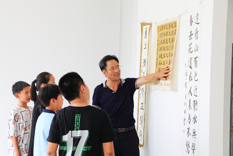 8月28日,在江心沙職工書屋二樓,一場為期一周,象征著收獲的青少年書法展,吸引了不少職工居民和學(xué)生前來觀覽。圖為“書迷”們觀摩“暑期公益課堂·書法班”“結(jié)業(yè)”作品的溫馨場景。